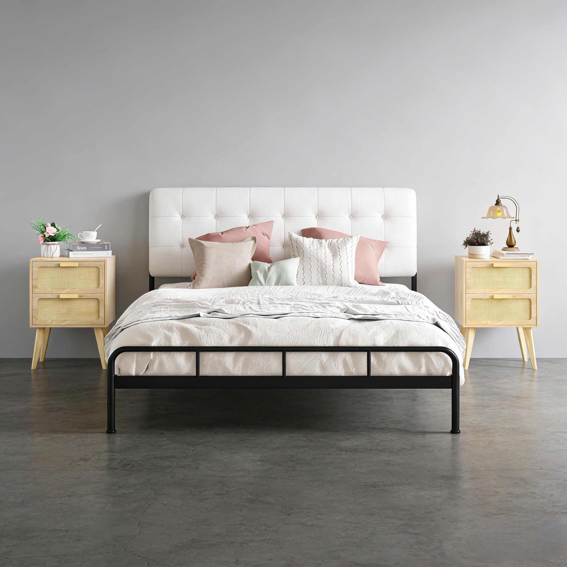 • Design Style: Mid-century modern aesthetic, featuring natural rattan panel inserts for a light, airy look